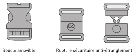 Boucle amovible : système clip-lock ou rupture sécuritaire anti-étranglement. Elle permet de détacher l'extrémité du tour de cou sans le retirer
